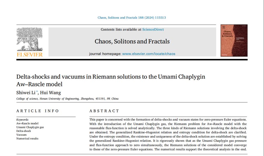 近日,必赢官网理学院研究团队在非线性科学领域国际著名学术期刊 《Chaos, Solitons & Fractals》上发表题为“Delta-shocks and vacuums in Riemann solutions to the Umami Chaplygin Aw-Rascle model (鲜味Chaplygin气体的Aw-Rascle交通流模型中黎曼解的狄拉克激波与真空)”的研究论文。李士伟博士为论文第一作者和通讯作者,王辉副教授为论文第二作者,437必赢会员中心为唯一完成单位。